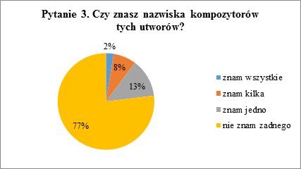 Pytanie trzecie sprawdzało bezpośrednią znajomość nazwisk kompozytorów prezentowanych utworów. Dzieci bezpośrednio odwoływały się do swojej wiedzy. Na liście autorów znajdowało się nazwisko Krzysztofa Pendereckiego, które mogło potencjalnie być znane uczniom z powodu jego stosunkowo dużej popularności, w przeciwieństwie do pozostałych nazwisk.