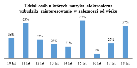 Jak wynika z rozkładu odpowiedzi największe zaciekawienie wywołała muzyka wśród 11-, 15- i 18-latków. Oznacza to że muzyka elektroniczna wydaje się być atrakcyjna dla młodych ludzi w różnym wieku. Dość duże zainteresowanie występuje także wśród 10 i 12-latków, co może oznaczać że muzyka elektroniczna jest nieco bardziej atrakcyjna dla młodszych dzieci.