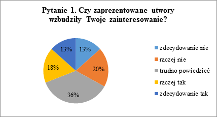 Największa część ankietowanych (38%) nie była w stanie stwierdzić, czy zainteresowały ich utwory. Jednocześnie otrzymano więcej odpowiedzi wskazujących na zainteresowanie niż na brak zainteresowania (odpowiednio 36% i 26%). Można przypuszczać, że po dokładnym przygotowaniu uczniów do wysłuchania utworów i dostarczeniu większej ilości informacji o nich, mogłyby one zainteresować jeszcze większą liczbę uczniów.
