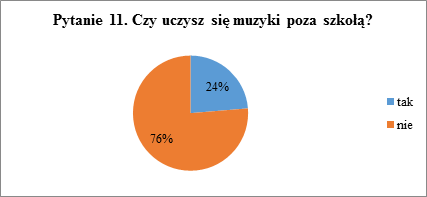 Jak wynika z pytania jedenastego 64% uczniów nie bierze udziału w żadnej pozaszkolnej formie nauki muzyki. Z takiej formy nauki korzysta 36% uczniów, co jest wynikiem większym niż w przypadku uczniów szkoły podstawowej. Może to wynikać z tego, że starsza młodzież chętniej samodzielnie poszukuje możliwości rozwoju niż młodsze dzieci.
