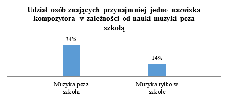 Widocznie więcej osób uczących się muzyki poza szkołą rozpoznaje nazwiska kompozytorów muzyki elektronicznej niż osoby, które nie uczęszczają na pozaszkolne zajęcia muzyki (dwudziestoprocentowa różnica).