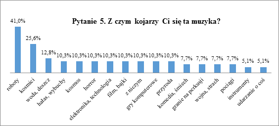 Odpowiedzi uczniów zostały ustandaryzowane do 17 kategorii. Każda z nich jest opisana jednym lub dwoma określeniami charakteryzującymi zawarte w nich odpowiedzi. Dzieci udzieliły dość zróżnicowanych odpowiedzi. Najczęściej powtarzającym się skojarzeniem są roboty (41%). Najprawdopodobniej bierze się to z charakteru muzyki elektronicznej, tworzonej z wykorzystaniem nowoczesnych, elektronicznych technologii. Oprócz robotów pojawiają się też inne skojarzenia techniczne. Jest to elektronika i technologia (10,3%), gry komputerowe (10,3%), pociągi (7,7%). Drugą najczęstszą odpowiedzią jest wskazanie skojarzenia z kosmitami (25,6%). To oddaje „pozaziemski” charakter tej muzyki, jej wyraźne zróżnicowanie od dźwięków instrumentów znanych człowiekowi. Poza kosmitami pojawia się też sam kosmos. Takiej odpowiedzi udzieliło 10,3% badanych. Wśród skojarzeń uczniów często występują skojarzenia ze światem natury: wodę, deszcz (w tym ich szum) wskazuje 12,8% ankietowanych natomiast szeroko pojęte odgłosy przyrody 10,3%. Dość charakterystyczne są odpowiedzi wskazujące na film i bajki (10,3%), co jest słusznym skojarzeniem, gdyż muzyka Studia Eksperymentalnego Polskiego Radia, z którego pochodziła część utworów pojawiających się w badaniu była bardzo często wykorzystywana do ilustrowania animacji, bajek i filmów eksperymentalnych. Zaprezentowana muzyka budzi też negatywne skojarzenia: horror (10,3%) wojna i strach (7,7%), hałas i wybuchy (10,3%). Jednocześnie u niektórych wzbudziła uczucia przeciwne, wskazano na komedię i śmiech (7,7%). Ostatnie skojarzenia to gra na perkusji (7,7%), uderzanie o coś (5,1%) oraz brzmienie instrumentów (5,1%). 10% ankietowanych nie wskazało żadnego skojarzenia z wysłuchaną muzyką.