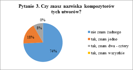Pytanie trzecie sprawdzało bezpośrednią znajomość nazwisk kompozytorów prezentowanych utworów. Dzieci bezpośrednio odwoływały się do swojej wiedzy. Na liście autorów znajdowało się nazwisko Krzysztofa Pendereckiego, które mogło potencjalnie być znane uczniom z powodu jego stosunkowo dużej popularności, w przeciwieństwie do pozostałych nazwisk.
