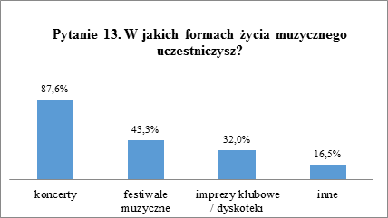 Największą popularnością cieszą się koncerty, w których bierze udział aż 87,6% badanych. W festiwalach muzycznych uczestniczy 43,3% uczniów, a na imprezy klubowe lub dyskoteki uczęszcza 32% z nich. W innych formach bierze udział 16,5% ankietowanych, a wśród nich są: wyjścia do opery, musicale, balet, udział w konkursach muzycznych oraz śpiew na uroczystościach związanych z kościołem. Dodatkowo 3 osoby wymieniły samodzielne słuchanie muzyki w domu jako formę życia muzycznego.