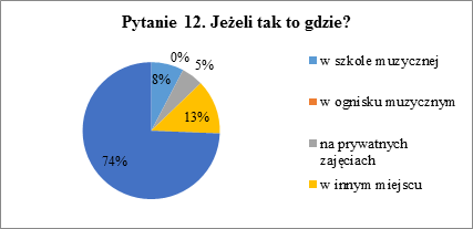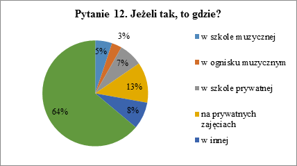 Pytanie 12. dotyczyło wyłącznie osób, które w pytaniu 11. zaznaczyły że uczą się muzyki w innej formie niż w trakcie zajęć szkolnych. Odpowiedzi, które mogli zaznaczyć to nauka w szkole muzycznej, nauka w ognisku muzycznym, nauka w szkole prywatnej lub na prywatnych zajęciach. Osoby korzystające z innej formy nauki miały w ankiecie miejsce na wypisanie jej.