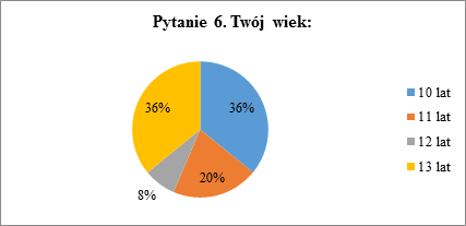 W szkole podstawowej największymi grupami przebadanych osób były grupy dziesięciolatków i trzynastolatków (po 36% badanych). Ponadto przebadano jedenastolatków, którzy stanowią 20% badanych osób i dwunastolatków stanowiących 8%.