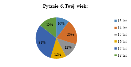 Pierwsze pytanie w tej części dotyczyło wieku badanych. Najliczniejszą grupą byli 17-latkowie (31%). Kolejną liczną grupą byli 14-latkowie (20%). Pozostałe grupy to osoby mające 15, 16 i 18 lat (kolejno 12%, 12% i 15%). Najmniej liczną była grupa trzynastolatków – 10%, których jest jednak więcej w pierwszej ankiecie. Tak zróżnicowany wiek respondentów daje nam szeroki wgląd w opinie młodzieży na badany temat.