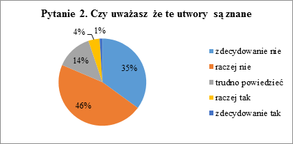 Największa ilość respondentów wskazała na przypuszczalny brak znajomości tych dzieł (raczej nie – 46%). Również zdecydowanie negatywna odpowiedź osiągnęła duży wynik (35%). Łącznie aż 81% uczniów uważa że zaprezentowane utwory nie są znane większej części społeczeństwa. Ponadto niewielka liczba ankietowanych wskazała na niezdecydowanie (trudno powiedzieć – 14%). Jedynie garstka uczniów stwierdziła że są one popularne – łącznie 5%. Odpowiedzi na to pytanie pokazują, jak duża część społeczeństwa może nie być świadoma istnienia dość ważnych dzieł, z punktu widzenia najnowszej historii muzyki.