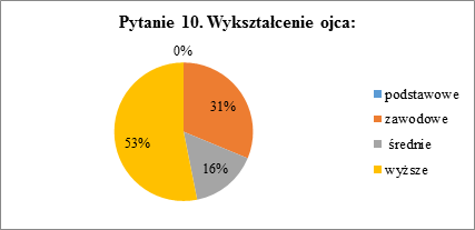 Analogicznie do poprzedniego pytania, w pytaniu 10. dzieci wskazywały wykształcenie ojca. Podobnie większość z nich posiada wykształcenie wyższe (53,1%). Wykształcenie zawodowe ma 31,3% ojców, a średnie 15,6% z nich. Tak samo jak w pytaniu 9. żaden z ojców nie zakończył edukacji na szkole podstawowej.