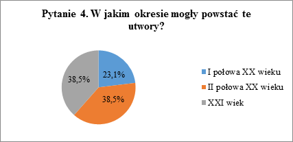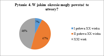 Czwarte pytanie ankiety dla uczniów gimnazjum i liceum ogólnokształcącego wymagało orientacyjnego umiejscowienia daty powstania prezentowanych utworów w określonym przedziale czasowym.