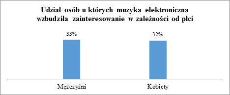 Rozkład osób zainteresowanych muzyką elektroniczną w trakcie badań według płci jest praktycznie wyrównany. Znajduje się wśród nich niemalże tyle samo mężczyzn, co kobiet (33% i 32%). Oznacza to że muzyka elektroniczna jest uniwersalna i atrakcyjna dla wszystkich bez względu na płeć.