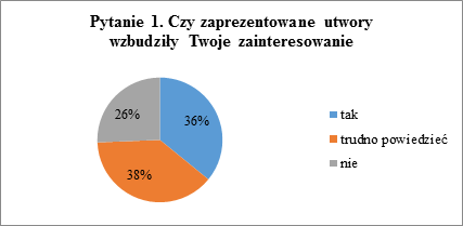 Największa część ankietowanych (38%) nie była w stanie stwierdzić, czy zainteresowały ich utwory. Jednocześnie otrzymano więcej odpowiedzi wskazujących na zainteresowanie niż na brak zainteresowania (odpowiednio 36% i 26%). Można przypuszczać, że po dokładnym przygotowaniu uczniów do wysłuchania utworów i dostarczeniu większej ilości informacji o nich, mogłyby one zainteresować jeszcze większą liczbę uczniów.