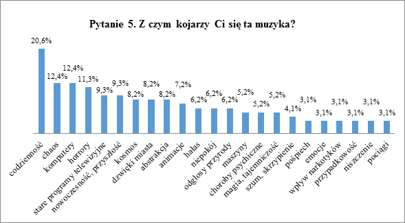 W piątym pytaniu ankietowani zostali poproszenie o wypisanie swoich skojarzeń do wysłuchanej muzyki. Odpowiedzi pogrupowano w 23 kategorii.