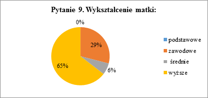 W pytaniu 9. Ankietowani wskazywali wykształcenie matki. W zdecydowanej większości posiadają one wykształcenie wyższe (65%). Kolejną dużą grupą są matki o wykształceniu zawodowym. Stanowią one 29%. Reszta posiada wykształcenie średnie (6%). Żaden z uczniów nie wskazał na to, że jego matka posiada tylko wykształcenie podstawowe.