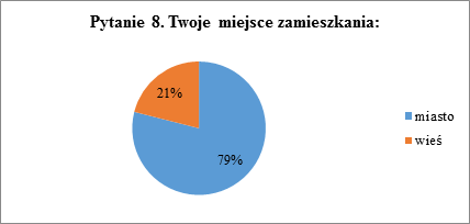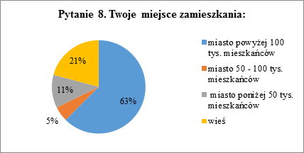 Pytanie ósme dotyczyło miejsca zamieszkania ankietowanych. Zostało poszerzone względem pierwszej ankiety o gradację wielkości miast. Uwzględniono w niej miasta małe (poniżej 50 tys. mieszkańców), miasta średniej wielkości (pomiędzy 50 a 100 tys. mieszkańców) oraz miasta duże (powyżej 100 tys. mieszkańców).