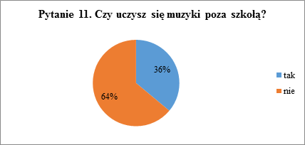Jak wynika z pytania jedenastego 64% uczniów nie bierze udziału w żadnej pozaszkolnej formie nauki muzyki. Z takiej formy nauki korzysta 36% uczniów, co jest wynikiem większym niż w przypadku uczniów szkoły podstawowej. Może to wynikać z tego, że starsza młodzież chętniej samodzielnie poszukuje możliwości rozwoju niż młodsze dzieci.