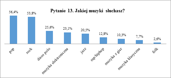 Ostatnie pytanie ankiety dla uczniów szkoły podstawowej ma na celu zbadanie ich preferencji muzycznych. Wśród najpopularniejszych gatunków muzycznych znalazła się muzyka pop (wskazało ją 56,4% ankietowanych) oraz rock (53,8% odpowiedzi). Dalszymi pod względem popularności są disco polo (25,6%), muzyka elektroniczna (23,1%) oraz jazz (20,5%). Reszta wskazanych przez dzieci gatunków to rap i hiphop, uzyskujące razem 12,8% odpowiedzi, muzyka z gier komputerowych, której słucha 12,8% ankietowanych i muzyka klasyczna lubiana przez 7,7% uczniów. Na końcu zestawienia znalazła się muzyka folkowa (2,6% odpowiedzi).