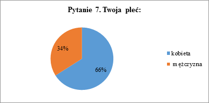 Jak wynika z kolejnego pytania, 2/3 przebadanych uczniów stanowią kobiety (66%). Mężczyźni stanowią mniejszą część (34%).