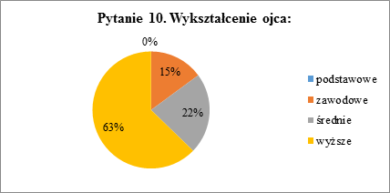 Spośród ojców ankietowanych uczniów, 63% osiągnęło wyższe wykształcenie. Średnią szkołę ukończyło 22% ojców, a 15% szkołę zawodową. Ponownie brak jest ojców tylko o wykształceniu podstawowym.
