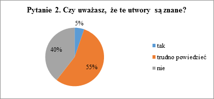Większość uczniów (55%) wskazała odpowiedź trudno powiedzieć , natomiast drugą najczęstszą odpowiedzią była odpowiedź nie. Prawdopodobnie osoby odpowiadające, że te utwory nie są im znane, odniosły się do swojej ogólnej znajomości muzyki i porównując znaną im muzykę do tej wysłuchanej, zauważyły wyraźne różnice. Odpowiedź wskazująca na powszechną znajomość utworów zaznaczyło zaledwie 5% ankietowanych. Można stwierdzić że zaprezentowana muzyka może wydawać się uczniom nieznana.