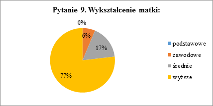 W pytaniu 9. uczniowie podawali poziom wykształcenia matki. W większości przypadków posiadają one wykształcenie wyższe (77%), osoby z wykształceniem średnim stanowią (17%), a z zawodowym (6%). W grupie badanych nie znalazły się osoby, których matka ma samo wykształcenie podstawowe.