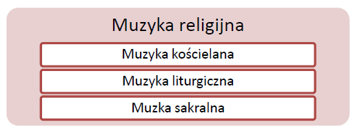 Pierwszym, podstawowym i najbardziej pojemnym terminem jest pojęcie muzyki religijnej. Ks. Ireneusz Pawlak w książce Muzyka liturgiczna po Soborze Watykańskim II w świetle dokumentów Kościoła przypisuje mu najszerszy zakres. Powołując się na Encyklikę Musicae sacrae disciplina Piusa XII oraz posoborową instrukcję Musicam sacram autor określa muzykę religijną jako mającą na celu wzbudzić uczucia religijne, ale nie nadającą się do użycia podczas liturgii[6]. Przeszkodą w wykorzystaniu jej podczas rytuału, według ks. Pawlaka, są następujące cechy: