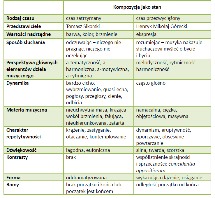 Podstawową dychotomię czasowości wyznacza para pojęć: proces – stan. ‘Proces’ w myśli teoretyczno-muzycznej utożsamiany był przez stulecia z tzw. dramaturgiczną formą finałową, cechującą się rozwojem i kształtowaną przez technikę przetworzeniową czy wariacyjną. Efektem tych zabiegów była zmienność i różnorodność, gra napięć i odprężeń[51]. ‘Stan’ odnosi się natomiast do muzyki nieprocesualnej, zastygłej, homogenicznej, w której podstawową techniką kształtowania jest repetytywność. Inaczej, za Jonathanem D. Kramerem, można określić ten rodzaj czasowości jako nieliniowy, gdzie brak jest wyraźnych wyznaczników procesu przyczynowo-skutkowego[52]. Pokrewna koncepcji kompozycji jako stanu wydaje się również kramerowska koncepcja czasu wertykalnego, rozumianego jako „kontinuum niezmienności, w którym nie istnieją oddzielone zdarzenia i wszystko wydaje się częścią wiecznej teraźniejszości”[53]. Pierwsza intuicyjna myśl każe rozpatrywać symfonie Ustwolskiej w kontekście formy jako stanu. Dorota Krawczyk za przykład utworów tego typu podaje kompozycje Tomasza Sikorskiego i Henryka Mikołaja Góreckiego, przy czym pierwsze z nich reprezentują czas zatrzymany, drugie czas przezwyciężony[54]. Esencję rozważań Krawczyk dotyczącą muzyki jako stanu przedstawia tabela: