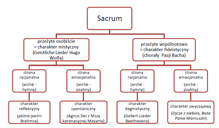 Mistyczny charakter aktu komponowania, postawa twórcy jako swoistego mediatora między Bogiem a ludźmi oraz jego przeświadczenie, że utwory powinny być wykonywane w przestrzeni sakralnej przywodzą na myśl różnego rodzaju relacje muzyki z tajemniczą sferą sacrum – muzyki określonej jako: duchowa, religijna, kościelna i sakralna. Choć kwestia definicji powyższych pojęć wciąż budzi wątpliwości wśród badaczy, do dalszych rozważań należy przyjąć pewne kryteria. Zostaną w tym celu przywołane koncepcje i hierarchizacje pojęć ks. Ireneusza Pawlaka, Mieczysława Tomaszewskiego oraz Reginy Chłopickiej.