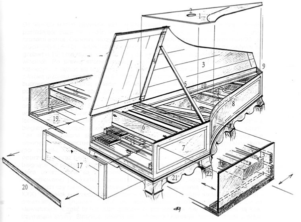 1. Płyta rezonansowa 2. Rozeta 3. Wieko 4. Cache-poussiere 5. Podpórka 6. Przednia deska skrzyni 7. Czoło 8. Deska wgięta 9. Deska ogonu 10. Deska grzbietu 11. Klawiatury