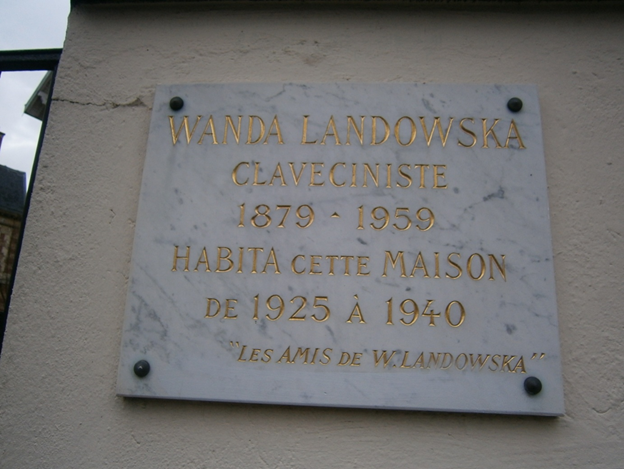 Zbliżenie tablicy pamiątkowej. Napis głosi: Wanda Landowska. Claveciniste. 1879 – 1959. Habita cette maison, de 1925 à 1940. “Les Amis de W. Landowska“ (Wanda Landowska. Klawesynistka. 1879 – 1959. Zamieszkiwała ten dom, od 1925 do 1940. ‘Przyjaciele W. Landowskiej’). Fotografia autora.