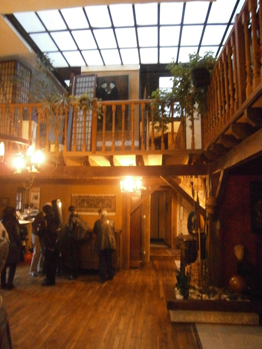Wnętrze sali koncertowej w Saint-Leu-la-Fôret. Widok w stronę zachowanej, choć słabo na zdjęciu widocznej, dawnej niskiej estrady. Przeszklony tarasowy dach jak niegdyś zapewnia jasne, lecz zarazem dyskretne oświetlenie wnętrza światłem słonecznym. Fotografia autora.