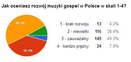 Ocena rozwoju muzyki gospel w Polsce uwydatniła brak jednomyślności w tej sprawie wśród polskiej społeczności. Prawie połowa ankietowanych – 49,3%, oszacowała rozwój tego gatunku jako zauważalny, 38,4% uznało jej udział na polskim rynku muzycznym za niewielki, 7,9% respondentów oceniło go jako bardzo prężny, zaś 4,3% wskazało na zupełny brak jego rozwoju. Odpowiedzi te uwidoczniły jak nikłą wiedzę na temat rozkwitu muzyki gospel w Polsce posiada wciąż część społeczności. Z pewnością wiedza ta wynika z różnorodnego poziomu zainteresowania ludzi tym tematem oraz z uwarunkowań rozmaitych środowisk, w których poruszają się dane osoby. Muzyka gospel, mimo że prężnie rozwija się w Polsce od kilkunastu lat, przez wielu nadal uważana jest za „nowość” w kraju. W przypadku osób starszych, prawdopodobnie wynika to z przywiązania do tradycyjnej muzyki religijnej związanej z liturgią, czego skutkiem jest mierne rozeznanie w świeżo rozwijających się gatunkach muzycznych. Wśród osób młodych to rozeznanie jest dużo szersze, jednak świadomość na temat rozwoju danego gatunku – w tym przypadku muzyki gospel, może zależeć od ich indywidualnych preferencji muzycznych. Jeśli dane osoby nie są zainteresowane muzyką tego rodzaju, równocześnie nie interesują się związanymi z nią aktualnymi wydarzeniami. Wpływu na tak różnorodną ocenę rozwoju gatunku gospel wśród Polaków upatrywać można także w nieznacznym rozpowszechnianiu jej przez polskie media (np. telewizję) powszechnie nie są one ukierunkowane na propagowanie muzyki chrześcijańskiej, przez co informacje o wydarzeniach z nią związanych nie docierają do tak szerokiego grona odbiorców.
