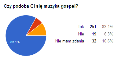 Na pytanie: „Czy podoba Ci się muzyka gospel?”, 83,1% ankietowanych odpowiedziało twierdząco, 6,3% – przecząco, a 10,6% zaznaczyło brak zdania w tej kwestii. Rezultat ten pokazał, jak dużym upodobaniem cieszy się wśród Polaków gatunek gospel. Zdecydowanie mniejszy odsetek odpowiedzi negatywnych pochodził od respondentów o zróżnicowanym wieku, o różnych wyznaniach i różnym stopniu wykształcenia muzycznego – dlatego też nie sposób stwierdzić, jaki czynnik spowodował ich niechęć do muzyki gospel.