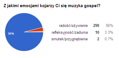 Kolejne pytanie dotyczyło wskazania z jakimi emocjami wiąże się muzyka gospel. 96% respondentów powiązało ten gatunek muzyczny z radością i ożywieniem, natomiast zaledwie 3,3% skojarzyło ją z refleksyjnością i zadumą, a 0,7% ze smutkiem i przygnębieniem. Z pewnością najbardziej adekwatną odpowiedź stanowi ta, którą wskazała znaczna większość respondentów, jednak nie można wykluczyć powiązania muzyki gospel z refleksyjnością, zadumą, a nawet ze smutkiem, ponieważ afekty te również mogą mieć znaczenie w jej repertuarze.