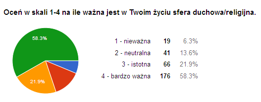 Na pytanie pierwsze – dotyczące określenia rangi znaczenia sfery duchowej/religijnej w życiu osobistym, 58,3% respondentów przyznało, że stanowi ona bardzo ważny aspekt ich życia, 21,9% określiło ją jako istotną, 13,6% neutralną, a 6,3% uznało ją za nieważną. Wynik ten nie okazał się zaskakujący, gdyż zbliżona liczba ankietowanych, która odpowiedziała, że sfera religijna pełni bardzo istotną lub istotną część życia, zaznaczyła w rubryce „Wyznanie” swoją przynależność do katolicyzmu bądź protestantyzmu, dając wyraz temu, że sfera religijna ma dla nich znaczenie. Ponadto odsetek ludzi wierzących jest w Polsce dość duży w porównaniu z innymi krajami europejskimi, dlatego też taki rezultat był do pewnego stopnia spodziewany.