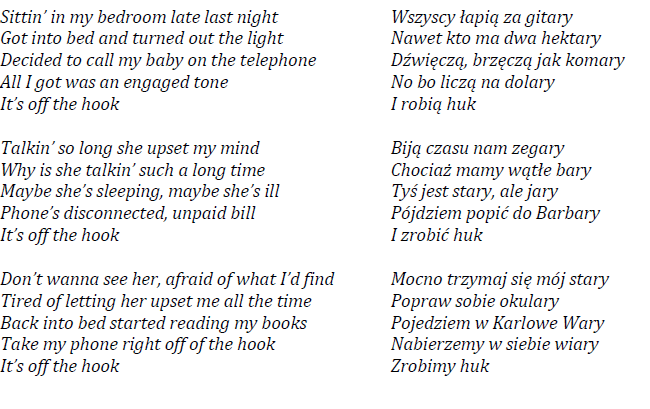 Interesującym etapem przejściowym na drodze od coverowania zagranicznych przebojów do oryginalnej, miejscowej twórczości, było tłumaczenie piosenek zachodnich na język polski[9]. Często zresztą jedynym co pozostawało z oryginału po takiej przeróbce, była muzyka – sens słów zmieniał się bowiem diametralnie. Dobry przykład takiego zabiegu stanowić może utwór Zrobimy huk zespołu bigbeatowego Szwagry, czerpiący mocno z wylansowanego przez Rolling Stonesów Off the Hook. Przyjrzyjmy się fragmentom tekstu obu piosenek.