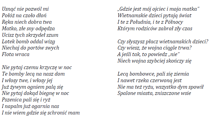 Z czasem ilość piosenek pisanych przez samych wykonawców rosła[11]. Pojawiać zaczęły się też utwory, które – przynajmniej potencjalnie – określić moglibyśmy jako kontestujące rzeczywistość. Antywojenne i antyestablishentowe piosenki znane nam z twórczości zachodniej (by wspomnieć chociażby o Fortunate Son Creedence Clearwater Revival, I-Feel-Like-I’m-Fixin’-to-Die Rag Country Joe & The Fish czy Volunteers Jefferson Airplane) znalazły swoje odpowiedniki w takich polskich kompozycjach jak Te bomby lecą na nasz dom Blackoutu i Czy słyszysz płacz wietnamskich dzieci? Następców Tronów[12]. Spójrzmy na fragmenty obu tych, opowiadających o wojnie w Wietnamie, bigbeatowych utworów.