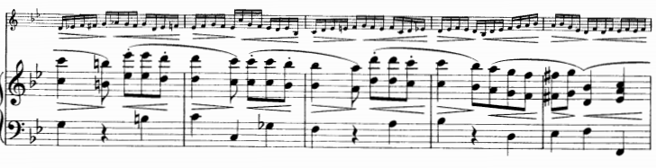 – motywy łukowane – stworzenie linearnego, ciągłego brzmienia na tle którego fortepian prowadzi melodię